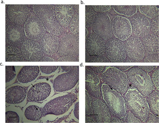 A Photomicrograph of H and E stained testicular cross section in adult male rat (a-d).