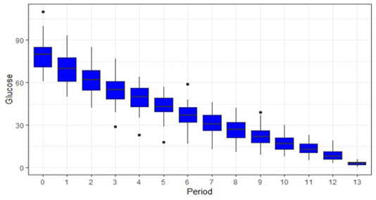 Box plot showing glucose value (mg/dl in Y axis) at different time period(X-axis). Here 13 and 0 on X-axis indicate the mean glucose value of all the samples at 24 hour and baseline glucose value respectively. Mean glucose value at 1 hour is significantly lower (p<0.005) than baseline value and glucose value at 2 hours is significantly lower than value 1 hour.