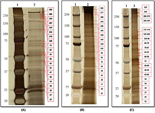 Protein analysis of O. felineus antigens by SDS-PAGE and visualization by Silver Quest Staining Kit: (A) ES-Ag; (B) S-Ag; (C) E-Ag. Line 1, molecular markers; line 2, electropherogram of antigens.