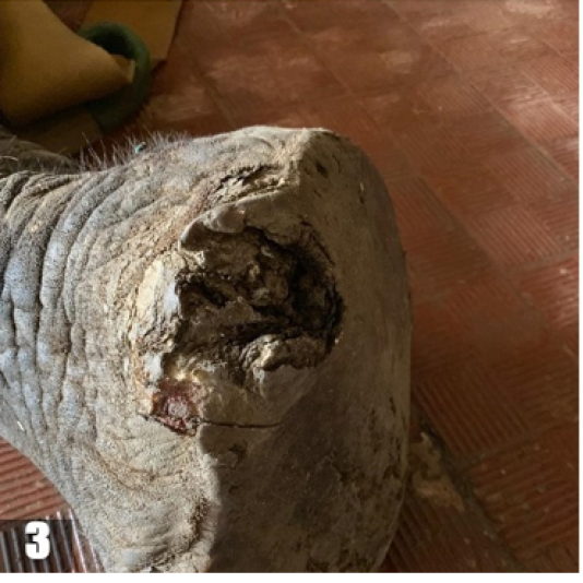 A chronic cracked sole at the junction of foot pad and skin penetrated deep into the food pad of right limb