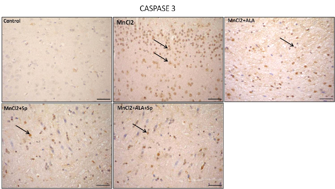 Photomicrograph of caspase-3 immunohistochemistry in the cerebral cortex showing intense expression of caspase-3 in MnCl2 treated rats compared to other groups. Marked improvement was acquired by the use of ALA and/or SP. Arrow indicates caspase-3 positive cells (stained brown) (Scale bar=50µm).