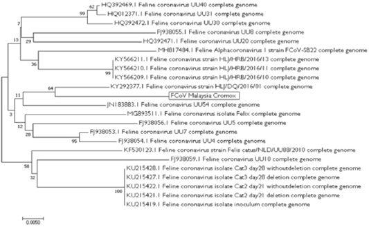 The unrooted phylogenetic tree between the local isolates FCoV Malaysia Cromox (in text box) with the reference isolates. The phylogenetic tree was constructed using maximum-likelihood method with 1000 bootstrap replicates. Based on this phylogenetic tree, the strain of Cromox is closely related to strain found in China and Netherlands.