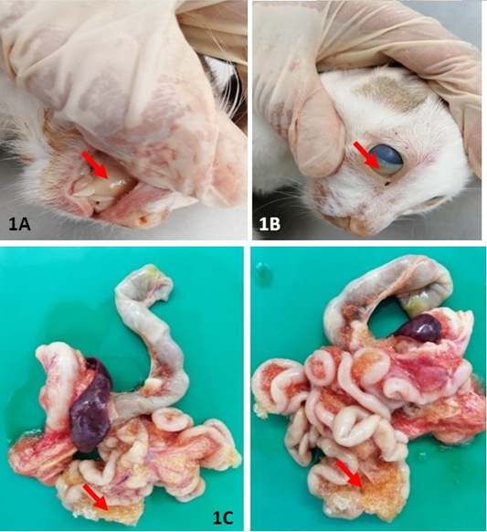 Gross lesion at necropsy: Extensive yellowish discolouration of mucous membrane (A) and conjunctiva (B) were indicative of severe jaundice. (C) and presence of extensive fibrinous plaque on serosal surfaces of intestines. All the lesions described have been indicated in arrow (↘).