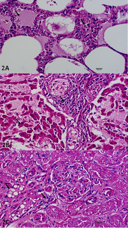 Histopathological Lesions. (A) Pulmonary edema and thickening of the interalveolar septae with leucocytic infiltration. H and E. X400. (B) Necrotising hepatitis, including necrotic changes on the hepatocytes with generalised infiltration of the leucocytes. H and E. X400. (C) Glomerular nephritis, including cytoplasmic vacuolation of the renal tubule (X) and epithelium clusters of scattered necrotic tubules (Y). H and E. X400. All the lesions described have been indicated in arrow (↘).