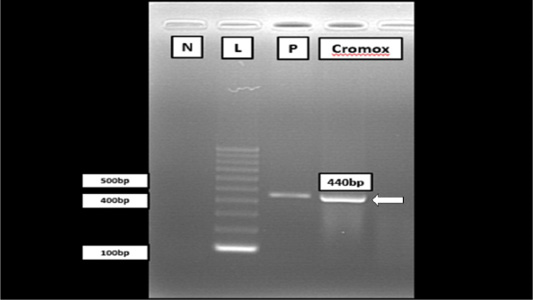 Gel electrophoresis of RT-PCR analysis from Cromox using primers targeting the conserved polymerase gene of FCoV. Lane N: Negative control; Lane L: 100 bp DNA marker (Vivantis, Malaysia); Lane P: Positive control; Lane C: Cromox. Remark: Deionized water was used as negative control.