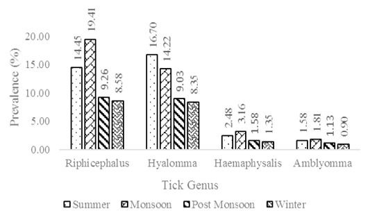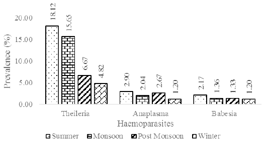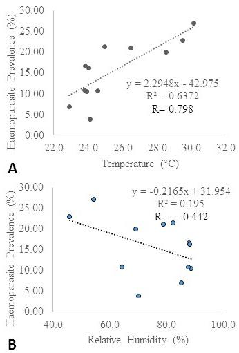 (A): Influence of temperature on haemoparasite prevalence*; (B): Influence of relative humidity on haemoparasite prevalence*.
