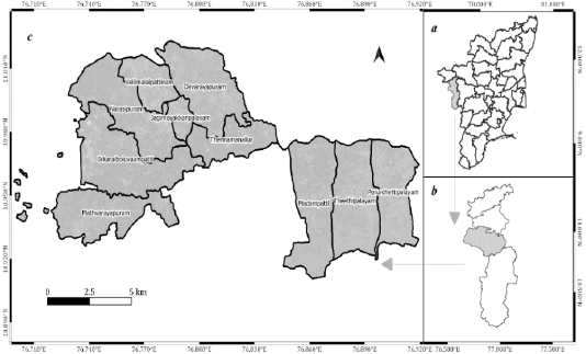 (a) The State of Tamil Nadu, (b) Coimbatore District, (c) Thondamuthur Block (Study area).