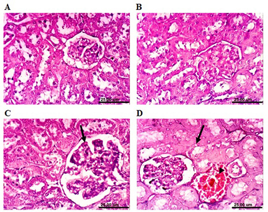 Photomicrograph sections from kidney of a male rabbit. (A) Normal control rabbits showing the normal histological architecture of renal parenchyma. (B) Moringa oleifera leaf ethanol extract- (MOLEE-) treated group (4 weeks) showing no histopathological alterations. (C) MOLEE-treated group (8 weeks) showing hypertrophy and vacuolation of glomerular tuft (arrow). (D) MOLEE-treated group (12 weeks) showing vacuolation of epithelial lining renal tubules (arrow) and renal blood vessel congestion (arrowhead). (H&E, scale bar: 25 µm).