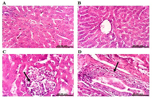 Photomicrograph sections from liver of a male rabbit. (A) Normal control group showing the normal histological structure of hepatic lobule. (B) Moringa oleifera leaf ethanol extract- (MOLEE-) treated group (4 weeks) showing no histopathological alterations. (C) Moringa oleifera extract-treated group (8 weeks) showing focal hepatic necrosis associated with inflammatory cell infiltration (arrow). (D) Moringa oleifera extract-treated group (12 weeks) showing hyperplasia of biliary epithelium and fibroplasia around the bile duct (arrow). (H&E, scale bar: 25 µm)