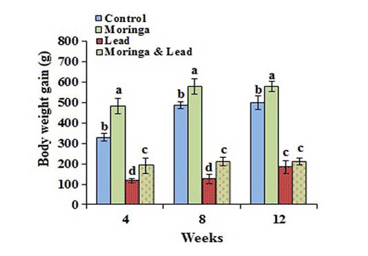 Body weight gain of male rabbits exposed to lead acetate and/or Moringa oleifera ethanol extract (mean SD, N = 5). Means with different letters (a, b, c, d) in the same period are significant at P<0.05.