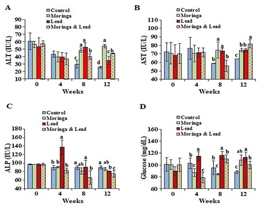 Serum enzymes activity and glucose of male rabbits exposed to lead acetate and/or Moringa oleifera ethanol extract. (A) alanine aminotransferase (ALT), (B) aspartate aminotransferase (AST), (C) alkaline phosphatase (ALP), (D) glucose concentrations (mean SD, N = 5). Means with different letters (a, b, c, d) in the same period are significant at P<0.05.