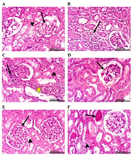 Photomicrograph sections from kidney of a male rabbit. (A) Lead-intoxicated group (4 weeks) showing vacuolation of epithelial lining renal tubules (arrowhead) and endothelial lining glomerular tuft (arrow). (B) Lead-intoxicated group (8 weeks) showing interstitial nephritis (arrow). (C) Lead-intoxicated group (12 weeks) showing vacuolation of epithelial lining renal tubules (arrowhead), focal necrosis of renal tubules (arrow), and cystic dilatation of renal tubules (yellow asterisk). (D) Moringa oleifera leaf ethanol extract- (MOLEE-) lead-intoxicated group (4 weeks) showing slight congestion of glomerular tuft (arrow). (E) MOLEE-lead-intoxicated group (8 weeks) showing slight vacuolation of epithelial lining renal tubules (short arrow) and endothelial lining glomerular tuft (arrow). (F) MOLEE-lead-intoxicated group (12 weeks) showing cytoplasmic vacuolation of epithelial lining renal tubules (short arrow) and eosinophilic proteinaceous cast in the lumen of renal tubules (arrow). (H&E, scale bar: 25 µm).