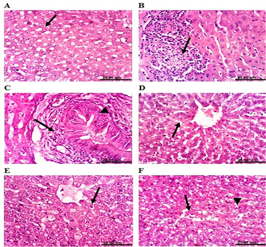 Photomicrograph sections from liver of a male rabbit. (A) Lead-intoxicated group (4 weeks) showing cytoplasmic vacuolization of hepatocytes (arrow). (B) Lead-intoxicated group (8 weeks) showing focal hepatocellular necrosis associated with inflammatory cell infiltration (arrow). (C) Lead-intoxicated group (12 weeks) showing hyperplasia of the biliary epithelium (arrowhead) and chronic cholangitis (arrow). (D) Moringa oleifera leaf ethanol extract- (MOLEE-) lead-intoxicated group (4 weeks) showing slight cytoplasmic vacuolization of hepatocytes (arrow). (E) MOLEE-lead-intoxicated group (8 weeks) showing slight hydropic degeneration of hepatocytes (arrow). (F) MOLEE-lead-intoxicated group (12 weeks) showing congestion of central vein (arrow) and vacuolar degeneration of hepatocytes (arrowhead). (H&E, scale bar: 25 µm).