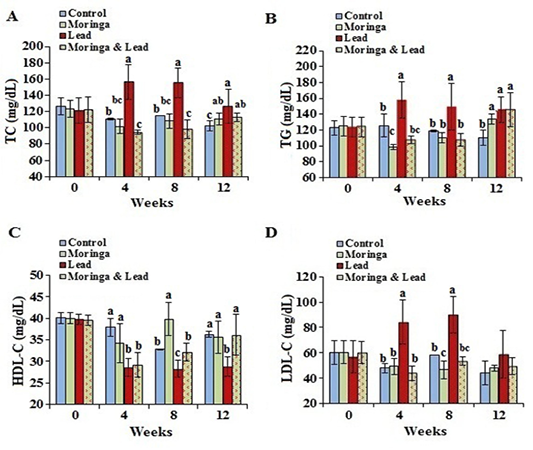 Serum lipid profile of male rabbits exposed to lead acetate and/or Moringa oleifera ethanol extract. (A) total cholesterol (TC), (B) triglycerides (TG), (C) high-density lipoprotein cholesterol (HDL-C), (D) low-density lipoprotein cholesterol (LDL-C) (mean SD, N = 5). Means with different letters (a, b, c) in the same period are significant at P<0.05.