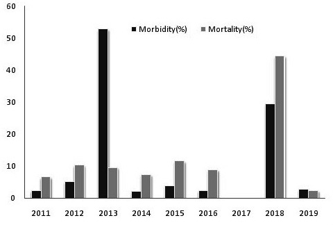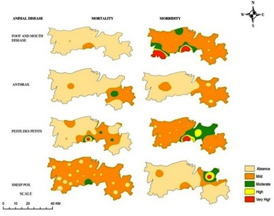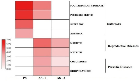 Categorization of the Livestock disease from surveillance: PS, Passive surveillance (20111-2018); (AS-1), Active surveillance in infected zone (Site-1), (2019); (AS-2), Active surveillance in disease-free zone (Site-2), (2019).