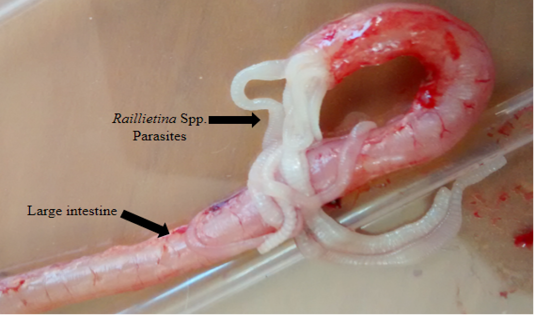 Pigeon large intestine blocked with abundance of Raillietina spp.