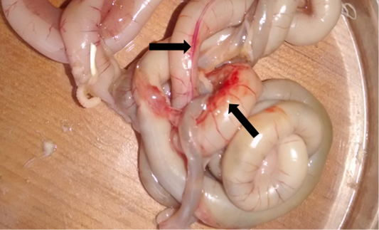 Thickened intestine clearly showing hemorrhage (arrows) at different point.