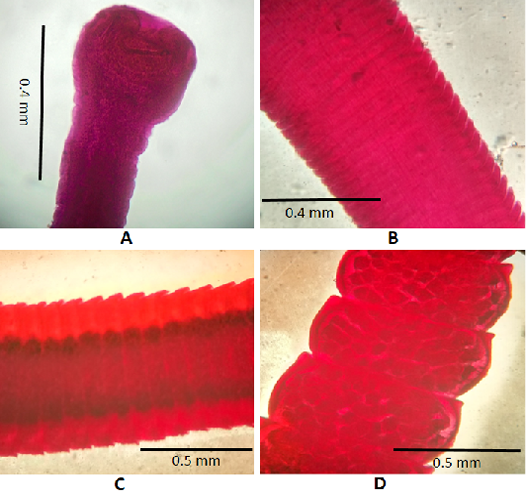Raillietina spp. (Fuhrmann, 1920). A: Scolex; B: Immature proglottids; C: Mature proglottids; D: Gravid proglottids occupied by uterine eggs.