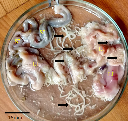 Pigeon intestine with abundance of Raillietina spp. SI: Small intestine; LI: Large intestine; Arrows: Raillietina spp.