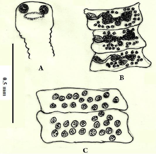Raillietina spp. (Fuhrmann, 1920). A- Scolex showing suckers and rostellum armed; B- Mature proglottids representing the reproductive organs and the position of cirrus sac; C- Gravid segments occupied by uterine eggs.