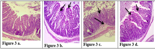 Description of histological changes in ileum sections. a): Group III, negative control animal feeding with saline solution, normal appearance of ileum (200 X)(H & E). b): Group II, positive control, animal feeding with E.histolytica cyst, (200 X)(H & E). c): Group I a, after injection with k-antigen the section in the ileum shows increases in length of intestinal microvilli and apoptosis in epithelial cell lining microvilli (200 X)(H & E). d): Group I b, section in jejunum after infection with E.histolytica shows simple degenerations in the cells surrounding microvilli with filtration of inflammatory cells inside the cavity of intestinal microvilli and decrease in goblet cells (200 X) (H & E)