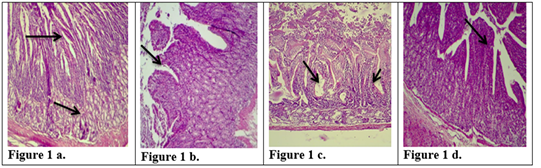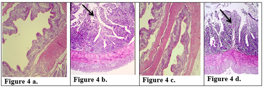 Description of histological changes in duodenum sections. a): Group III, negative control, animal feeding with saline solution. Normal appearance of microvilli, Brunner’s glands in duodenum. (200 X),(H & E)). b): Group II, positive control, animal feeding with E.histolytica cyst, hyperplasia and increases in microvilli and mucosal glands of duodenum. (200 X),(H & E). c): Group I a, section in the animal duodenum immunized by K-antigen, showing hyperplasia increases in length of intestinal microvilli (200 X),(H & E) d): Group I b, section in the duodenum shows the presence of hypoplasia of the intestinal microvilli with an increase in the mucous glands after infected immunized animal with E.histolytica (200 X)(H & E).