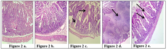 Description of histological changes in the jejunum sections. a): Group III, negative control, (200 X) (H & E). b): Group II, positive control, hyperplasia, (200 X) (H & E). c): Group I a, the section in jejunum shows increases in goblet cells and increases in length of mucosa region lining jejunum after an immunized animal with K-antigen (200 X) (H & E). d): Group I b, section in jejunum shows hyperplasia in the lymphatic glands (peyer’s patch) L.N. of submucosa with germinal center this refers to induce immunity (100 X) (H & E). e): Group I b, section in jejunum after infection with E.histolytica shows simple degenerations in the cells surrounding microvilli with filtration of inflammatory cells inside the cavity of intestinal microvilli and decrease in goblet cells (200 X)(H & E).