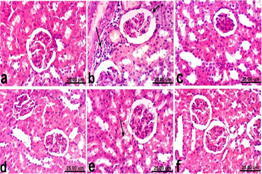 Kidney of rat a) from control, normal group showing the normal histological structure of renal parenchyma from renal cortex and medulla. b) Treated with paracetamol showing thickening of the parietal layer of Bowman’s capsule (short arrow) and focal inflammatory cells infiltration (long arrow). c) Co-treated with paracetamol+ silymarin showing apparent normal renal tissue. d) Treated with silymarin showing no histopathological alterations. e) co-treated with paracetamol + cardamom showing slight vacuolization of epithelial lining some renal tubules (arrow). f) Treated with cardamom showing no histopathological alterations. (H & E, scale bar 25 um).