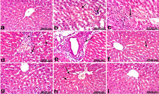 Liver of rat a) from control, normal group showing the normal histological structure of hepatic lobule from central vein surrounded by radiating hepatocytes. b), c), d) and e) treated with paracetamol, b) showing hepatocellular vacuolization (short arrow) and sinusoidal leukocytosis (long arrow). c) showing focal hepatocellular necrosis associated with inflammatory cells infiltration (arrow). d) showing Kupffer cells activation (short arrow) and apoptosis of hepatocytes (long arrow). e) portal fibrosis (arrow). f) co-treated with paracetamol + silymarin showing Kupffer cells activation (arrow). g) treated with silymarin showing no histopathological alterations. h). co-treated with paracetamol + cardamom showing slight activation of Kupffer cells (short arrow) and binucleation of hepatocytes (long arrow). i) treated with cardamom showing no histopathological alterations. (H & E, scale bar 25 um).