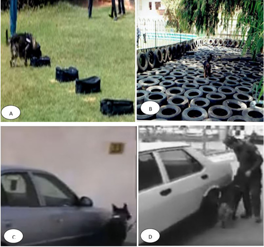 Illustrated dog search in different sites: (A) line up of luggage, (B) outdoors, (C and D) outside cars.