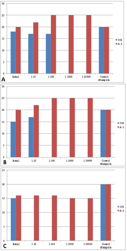 Antagonistic activity of the created association of lactic acid bacteria and L. salivarius 8d strain against brucellae. Note: (a) B. abortus; (b) B. melitensis; (c) B. suis.