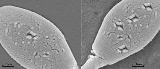 Scanning electron microscopy of thawed sperm cells of a stallion without the addition of mycotoxin (left) and with the addition of mycotoxin (right). Scale segments - 1 µm.