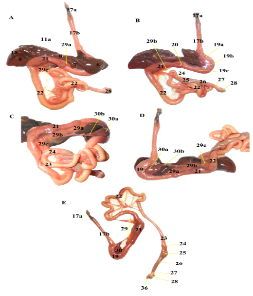 Photographs showing the Separated GIT; A; Ventral view, B; reflection of left lobe of liver, C; reflection of duodenum upward, D; parietal surface of stomach in relation to spleen, E; liver was removed.