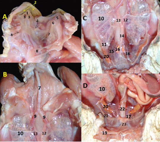 A. Roof and floor of oropharynx; B, C, D; anterior, middle, posterior parts of coelomic cavity of female African side neck turtle, respectively. 1. Hard palate, 2. Villiform papillae, 3. Internal Choanae, 4. Opening of Eustachian tube, 5. Tongue, 6. Glottis.7. Trachea, 8. Cut oesophagus, 9. Extra pulmonary bronchus, 10. Lung, 11. posterior angle of lung, 12. Left aorta 13. Right aorta, 14. Dorsal aorta 15. Kidney, 16. Adrenal gland, 17. Ureter, 18. Segmental artery, 19. Urinary bladder (reflected), 20. Ovary, 21. Oviduct, 22. Descending Colon, 23. Cloaca.