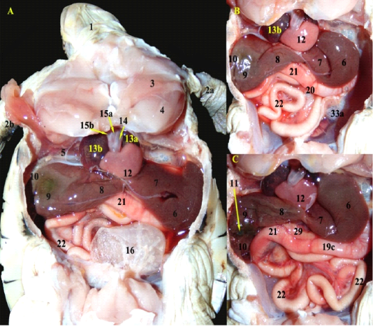 A; A photograph showing the ventral view of the coelomic cavity of African side neck turtle (fresh specimen) B; The urinary bladder was totally reflected, C; The right lobe of liver was slightly reflected.