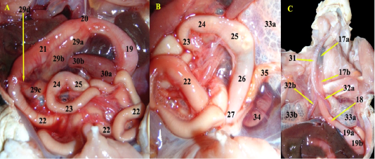 A; Photograph showing the pancreas parts after slight reflection of duodenum upward and rostrally, B; Magnified spleen in relation with the pancreas, C; The thoracic muscles were removed, neck was dissected and heart was removed.