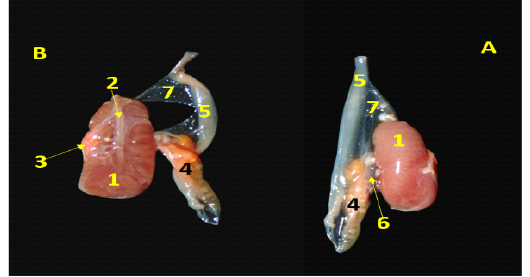 Photographs showing kidney in relation with ovary, A. Dorsal view; B. Ventral view, 1. Kidney, 2. Segmental artery, 3. Adrenal gland, 4. Ovary, 5. Oviduct, 6. Mesovarium, 7. Mesosalpinx.