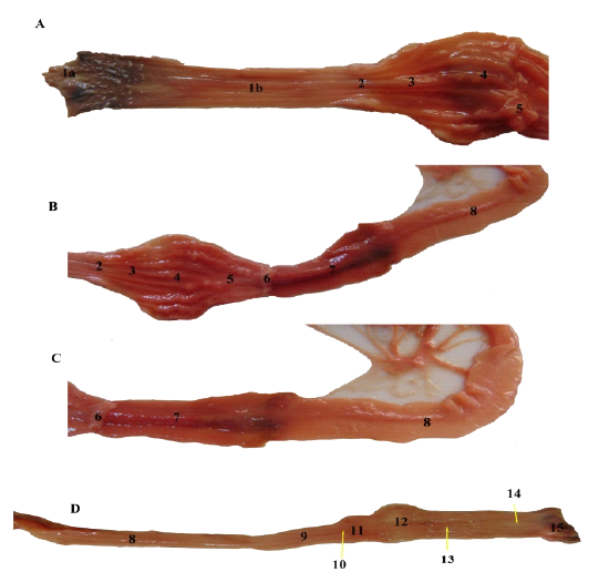 A, B, C &D: Photographs showing the opened gastrointestinal tract parts showing their mucosa.1a. 1st third of Oesophageal mucosa (pigmented and papillated with small pointed cones), 1b. Last two thirds of Oesophageal mucosa with numerous thin longitudinal folds, 2. Gastro oesophageal sphincter mucosa with small longitudinal folds without papillae. 3. Cardiac region of stomach with thin longitudinal mucosal folds, 4. Fundic part with thick corrugated longitudinal folds, 5. Pyloric region with few longitudinal folds. 6. Pyloric sphincter mucosa without any folds. 7. Duodenum smooth, dark red colored mucosa, 8. Jejunal mucosa, 9. Ileum mucosa, 10. Ileocecal valve mucosa, 11. Cecal smooth mucosa (saccular region), 12. Transverse colon smooth mucosa, 13. Descending colon mucosa with rectilinear folds, 14. Rectal smooth mucosa, 15. Cloacal mucosa.