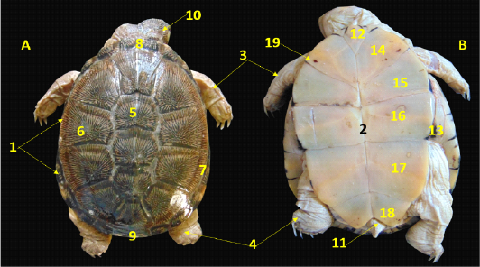 A. Dorsal view, B. Ventral view showing the external features of the female African helmeted turtle. 1. Carapase, 2.Plastron, 3.Forelimb, 4. Hind limb, 5.Vertebral scute, 6. Lateral costal scute, 7. Marginal scute, 8. Nuchal scute, 9. Supracaudal scute, 10.head, 11. Tail, 12. Gular Plastral scute, 13. Inguinal Plastral scute, 14. Humeral Plastral scute, 15. Pectoral Plastral scute, 16. Abdominal Plastral scute, 17. Femoral Plastral scute, 18. Anal Plastral scute, 19. Rathke’s pores