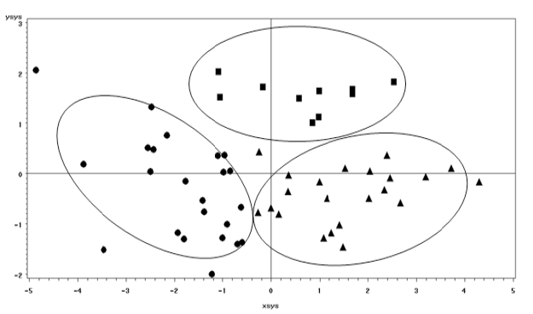 Projection of the morphometric measurements of the three animal groups identified by the cluster analysis based on the two principal components. : Cluster 1, : Cluster 2, : Cluster 3.