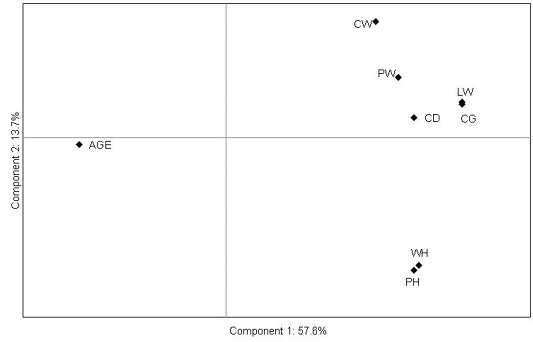 Projection of the morphometric measurements in the plane defined by the first two principal components. Live weight (LW); chest depth (CD); chest girth (CG); chest width (CW); pelvis width (PW); withers height (WH); and pelvis height (PH).