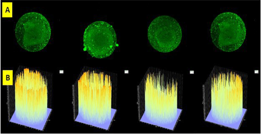 Slice of oocytes with a thickness of 5 µ (A) and read with Olympus Fluoview software version 4.2a. Caspase 3 intensity of frozen oocyte post vitrification group emitted by fluorescent luminescence in caspase 3’s oocyte that binds to secondary antibodies labeled FITC. The higher the intensity of caspase 3 in the oocyte indicated the higher the intensity and profile numbers on the graph were showed by the line density in yellow. The expression and intensity of caspase 3 of frozen oocyte post vitrification group were very high (B).