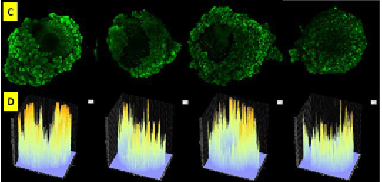 Oocyte slices before checked with Olympus Fluoview software version 4.2a emitted by green fluorescence (C). Graphic image of the intensity of caspase 3 fresh oocyte group emitted by fluorescent luminescence in caspase 3 oocyte that binds to secondary antibodies labeled FITC. The expression and intensity of caspase 3 of fresh oocyte group were lower than frozen oocyte post vitrification group (D).