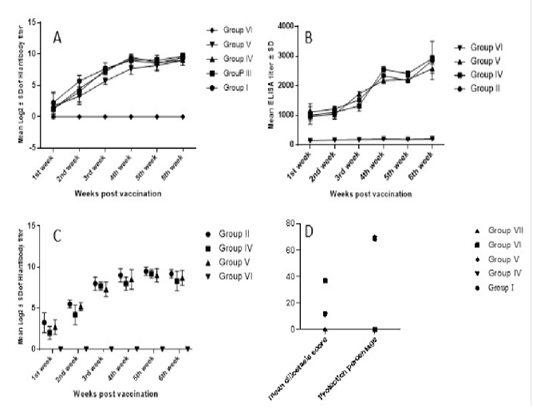 Serological monitoring and ciliostasis for vaccinated and challenged chicken groups. A) NDV HI titers in vaccinated groups. Response was fast, started one-week post vaccination (wpv) and reached its paek 4wpv. B) IBV ELISA titers in IBV-vaccinated groups. Group IV antibodies were significantly higher than group V. The highest ELISA titer was recorded 6wpv in group IV sera. C) IBV HI titers, peak titers have been recorded 5wpv. Vaccinated groups differed significantly from challenged non-vaccinated group (group VI) but not from each other. D) IBV protection percentages based on ciliary protection; vaccinated groups scored ciliostasis scores around 11 where scores ≤ 20 are considered protective. Challenged non-vaccinated group ciliostasis score was 37 indicating lack of protection. Protection percentages in vaccinated groups was around 70.