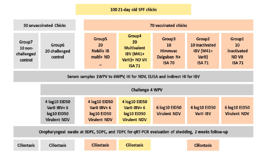 SPF chicken groups vaccination and challenge details. Chicks were vaccinated and challenged 28 days after vaccination according to their vaccination. Groups 4, 5, and 6 were divided at the time of challenge into 2 groups (n=10 each), kept in separate isolators and challenged with either NDV or IBV. Swabs were collected 3, 5, and 7DPC for viral shedding determination. For IBV vaccinated groups ciliostasis test was performed 7DPC