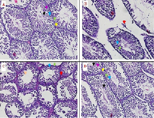 The identification of seminiferous tubule tissue and leydig cells from rat testes through histopathology anatomy (HPA) method with hematoxylin eosin (HE) staining on some treatments. Yellow arrow () = normal leydig cells, red arrow () = nekrosis leydig cells, green arrow () = spermatogonia cells, blue arrow () = spermatocyte primary-secondary, black arrow () = normal spermatid cells, orange arrow () = nekrosis spermatid cells, purple arrow () = sertoli cells.
