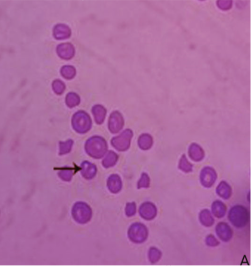 Blood film stained with Giemsa from infected cattle (Group B). Arrow showing B. bigemina infected RBCs.