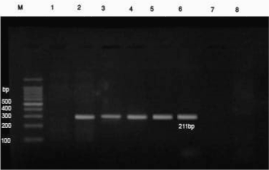 PCR findings of B. bigemina infected samples. M- Ladder of 100 base pair. (1) Control -ve, (2) B. bigemina control +ve, (3-6) positive babesiosis samples of 211 bp, 7 and 8 negative samples. The positive babesiosis samples showed the specific amplicon size of B. bigemina apical membrane antigen 1 (AMA-1) of 211bp.