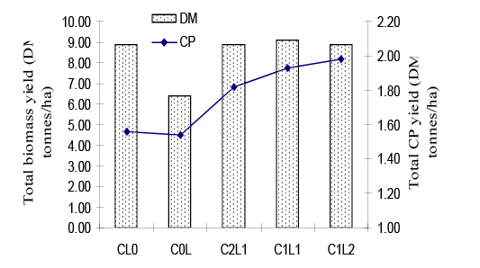 Effect of intercropping cassava and legume on total biomass yield (DM tonnes/ha) and total CP yield (tonnes/ha) of foliage according to harvest frequency.