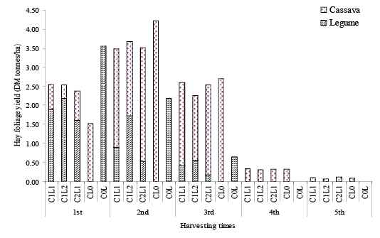 Effect of intercropping cassava and legume on hay yield (DM tonnes/ha) according to harvest frequency.